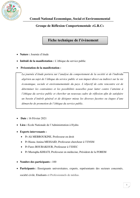 Dans le cadre de la série d'activités que le Conseil National économique, Social et Environnemental – CNESE a lancé cette année, qui se présenteront sous la forme de Groupes de Réflexion Comportementale – GRC dans le but d'étudier les phénomènes sociétaux ayant un impact majeur sur le plan économique, social et environnemental en Algérie. Le Conseil National économique, Social et Environnemental – CNESE, organise en partenariat avec l’école nationale d’administration une journée d'étude sur la thématique suivante : Ethique du service public En évoquant les points suivants : La motivation du personnel administratif au respecte de l’éthique du service public Les outils nécessaires pour développer cette culture Le 16 Février 2021, à l’école nationale d’administration La journée d'étude est organisé et encadré par des experts du domaine et à laquelle participent des représentants de divers secteurs ministériels, ainsi que des institutions économiques, des enseignants – chercheurs, des représentants de la société civile
