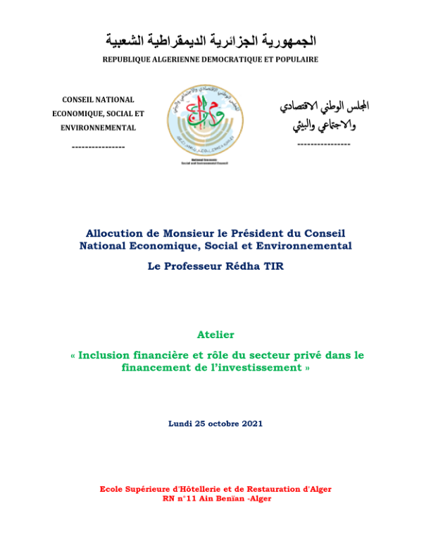 Le Conseil Economique, Social et Environnemental (CNESE) a organisé le 25 octobre 2021, au niveau de l'Ecole professionnel Supérieure d'Hotellerie et de Restauration sise à Alger, un atelier professionnel traiant de "l'inclusion financière et le role du secteur privé dans le financement de l'investissment".