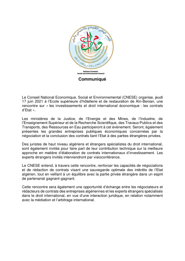 Le Conseil National Economique, Social et Environnemental (CNESE) organise, jeudi 17 juin 2021 à l’Ecole supérieure d’hôtellerie et de restauration de Aïn-Benian, une rencontre sur « les investissements et droit international économique : les contrats d’Etat ». Le CNESE entend, à travers cette rencontre, renforcer les capacités de négociations et de rédaction de contrats visant une sauvegarde optimale des intérêts de l’Etat algérien, tout en veillant à un équilibre avec la partie privée étrangère dans un esprit de partenariat gagnant-gagnant. Cette rencontre sera également une opportunité d’échange entre les négociateurs et rédacteurs de contrats des entreprises algériennes et les experts étrangers spécialisés dans le droit international, en vue d’une interaction juridique, en relation notamment avec la médiation et l’arbitrage international.
