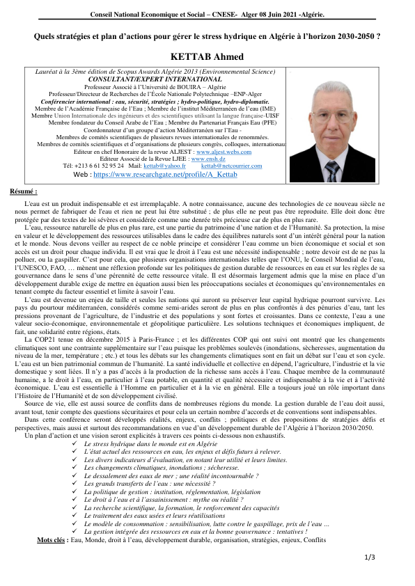 Sous l’intitulé « le stress hydrique en Algérie », le Conseil national économique, social et environnemental (CNESE) organise mardi 8 juin à l’école supérieure d’hôtellerie et de restauration un séminaire auquel participeront, outre les institutions et établissements directement concernés par cette problématique, des représentants des entreprises économiques publiques et privées, des chercheurs universitaires ainsi que des représentants de la société civile organisée. Un panel de haut niveau constitué de spécialistes nationaux et étrangers animera cette rencontre et abordera notamment les vulnérabilités des potentialités hydriques pour l'Algérie, face à une croissance démographique et la demande sans cesse ascensionnelle de cette denrée vitale, accentuées par les changements climatiques et les comportements néfastes des citoyens à l’égard de l’eau parmi lesquels, le gaspillage, la déperdition, les fuites et les vols.